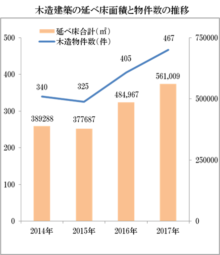 今回は、木造建築に着目をしてみようと思います。なぜなら、最近、木造建築の情報が、やたらに目につくからです。実際に、2014年から2017年の4年間の情報をKJ-NETから抽出すると、2015年に延べ床面積が微減しているものの、物件数は確実に増えていることが分かりました。