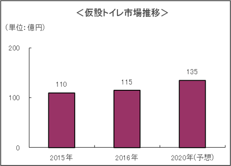 2016年における仮設トイレの市場規模は、メーカー出荷ベースで115億円と推定され、2015年の110億円と比較し4.5%増加しています。大手メーカーの予測では東京オリンピック・パラリンピックの開催年である2020年には135億円に達するとされています。