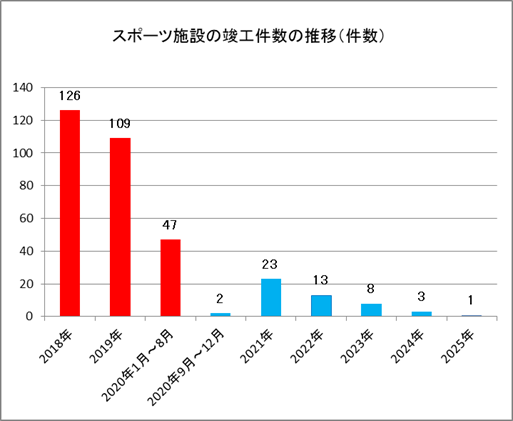 東京オリンピック(パラリンピック)の開催まで、あとを2年を切ろうとしています。そこで、今回は、KJ-NETの中から、オリンピック開催の2020年を軸にスポーツ関連施設数の推移を見てみました。グラフは、2018年から2025年までの竣工予定の運動施設の件数を表したものです。赤い棒がオリンピック前、青い棒がオリンピック後になります。あくまでも、2018年5月現在のKJ-NET登録件数ですが。