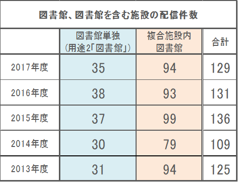 今回は図書館の2013年度から2017年度を表にしてみました(重複を除く)。推移としては公共性の高い施設だけに、大きな変化はなく、安定的な需要が見込まれていますが、図書館の領域は広がっています。