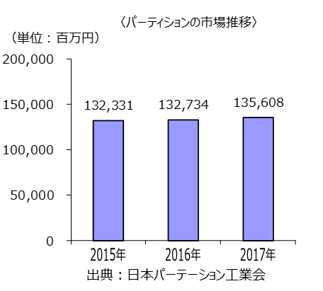 今回はパーティション(間仕切)市場の動向について解説します。日本パーティション工業会によると、2016年のパーティション市場は対前年比ほぼ横ばいの132,734百万円でしたが、2017年は135,608百万円と2.2%のプラスとなりました(グラフ参照)。