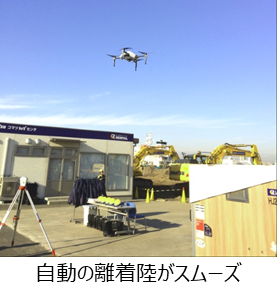 そして測量用のドローンの飛行デモ。スタートするとあっという間に小さく見える高度まで上昇します。現場の情報を取得して元の位置に戻ってくる様は、人の目や手の延長として優秀な忠犬のよう。取得した情報は建機や作業用端末などと共有するといった、トータルでのICTの運用例を見学できます。