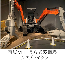 まず展示室に入ったらすぐ4つの足(クローラ)に2本の腕の「四脚クローラ方式双腕型コンセプトマシン」がお出迎え。不整地に強く、東日本大震災の時に活躍し注目されたとのこと。「ロボットのような重機をつくりたい」という若手技術者の想いを日立建機が組み上げたそうです。これで一気に心がつかまれました。