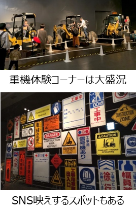 整地、建設、解体といった工事現場の工程ごとに、最新のブルドーザなどの実機(全10機)、大型クレーンの運転席や解体現場で活躍する油圧ショベルのパーツなど、迫力ある重機を間近に観察しながら工事現場の世界を体感。