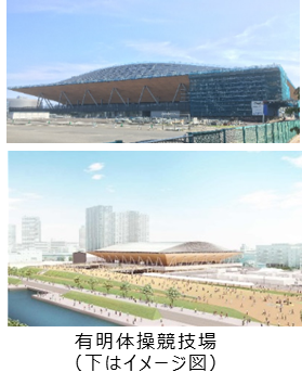 有明アリーナと首都高速10号線を挟んで向かい側にある有明体操競技場では、オリンピックの体操競技、パラリンピックのボッチャ競技を予定。地上3階、延床面積36,800㎡、ウォームアップ施設は地上1階4,000㎡の規模。
