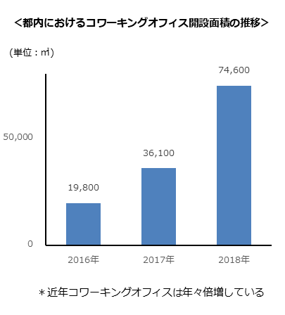 コワーキングオフィスが注目されています。グラフにあるように2018年の都内のコワーキングオフィスの開設面積は74,600㎡であり、ここ2年間で4倍近い伸びを示しています。働き方改革でワークプレイスのあり方が変化していることもありますが、なぜここまで伸びているのか、今回はコワーキングオフィスが急拡大している背景と展望を追います。