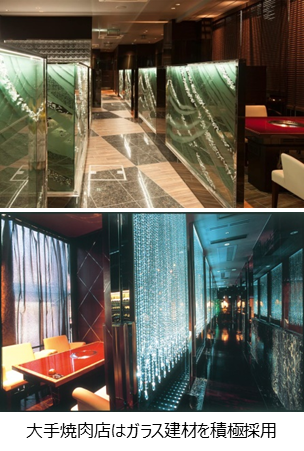 飲食店の中には、機能性だけでなく、意匠性の高い建材を多く採用したいと考える事業者も見られます。全国展開している大手高級焼肉店では、意匠性の高いガラス建材を積極的に採用しています。その多くが特注品であったり、他の建築用途では中々採用出来ないような高額なガラス建材を採用しています。「多くのお金を払って来店されるお客様に対して、美味しい食事と快適な空間で寛いで貰いたい」という施主の意向が大きな要因ですが、それだけでなく、実用性も計算された上での建材選定です。焼肉店では換気設備で排煙していますが、どうしても空気中の油分が多くなり、店舗内装を徐々に汚していきます。壁紙や木板は油分を吸着してしまい、油汚れが拭き取れません。そこで、洗剤で拭き取るだけで汚れが落としやすい「ガラスパーテーション」や「ガラス製の内装材」を多く採用する理由にもなっています。