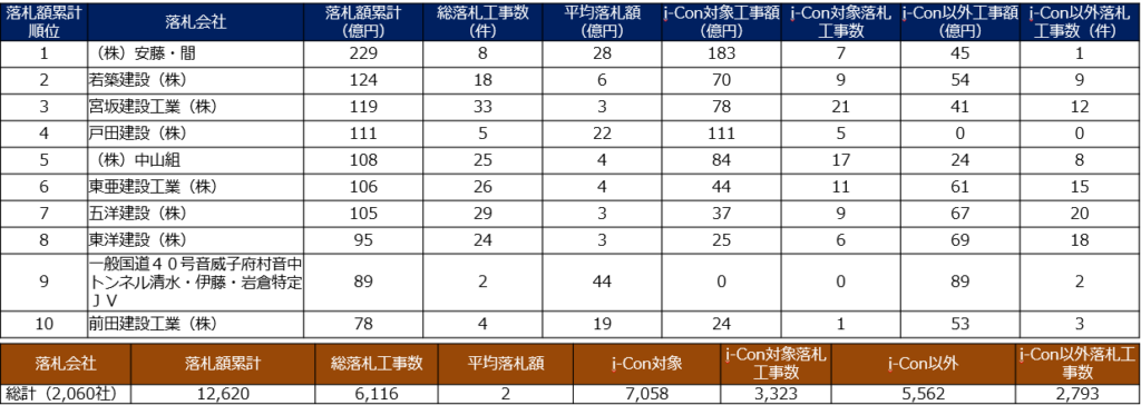 また切り口としてはi-Construction対象工事(ICT活用工事)を例に挙げたい。i-Con対象の工事件数、落札額共に全体の半数以上を占めている。特に累計落札額はi-Constructionに対応していない工事と比較して約1,500億円の差が出た結果だ。こうした情報抽出の切り口は都道府県などのエリアや応札業者を含めた落札率の抽出など項目の角度を変えることで、各企業とその商品、営業戦略にフィットさせることができる。先行きに不安を感じやすい今だからこそ、データに基づいた動きが必要になる。