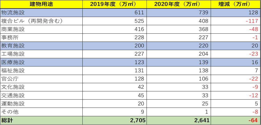2020年度の延床700㎡以上の非住宅着工延床面積は、2,641万㎡となります。これは、2019年度の同月配信点で比較すると64万㎡減(対前年度比97.6%)となります。