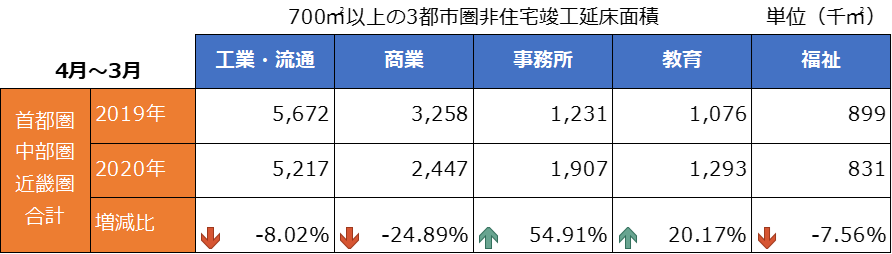 2019年度と比較すると増減が著しい用途が多く、特に商業施設の減少と事務所の増加が目立った。2021年度でもこの傾向が続いていくのか、引き続き注目していく。