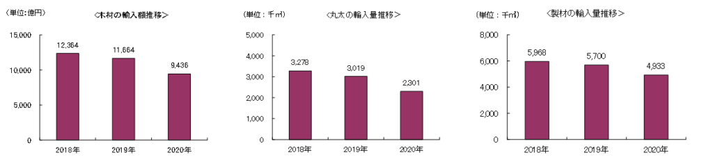 こうした輸入木材の減少要因としては、①特に米国において在宅勤務の普及により特に2020年6月頃から住宅ブームの発生、②早期にコロナを抑え込んだ中国でも経済回復の期待感から木材の輸入量が増大、 ③新型コロナ禍の混乱により、世界的に海上輸送用のコンテナ不足、等が挙げられます。