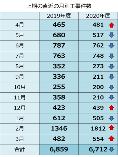 2020年度で2019年度より件数が多い月は4月、12月、2021年2月、2021年3月のみだ。しかも50件以上多い月は2月のみとなる。2月の多さは発注者の年度内における「帳尻合わせ」と言える。2019年度より減少したが、コロナ禍において他業種が被った打撃を考えると、約150件の減少で留まったと言える。
