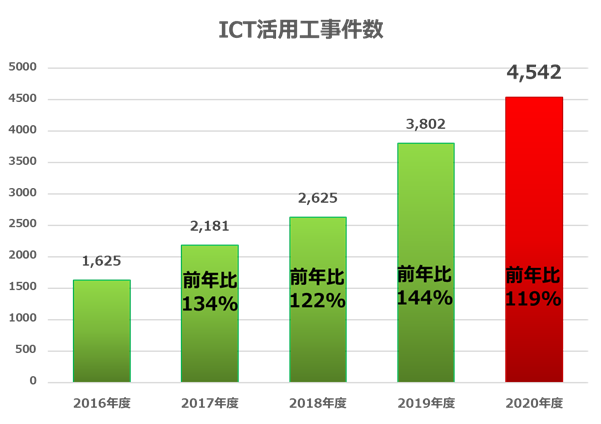 2020年度工事件数は6,712件。その内ICT活用工事の公告数は4,542件となった。なんと2017年度年間の2倍以上だ。 前年度比の伸び幅は落ち着き、2019年度に対して119.4%の増加にとどまっている。4年連続の増加となり、「工事のICT化」が進み既存の工事や業務がICTに置き換わっていることを示唆する数値となった。2021年度がどういう展開を見せるか、今後も要注目の要素になる。