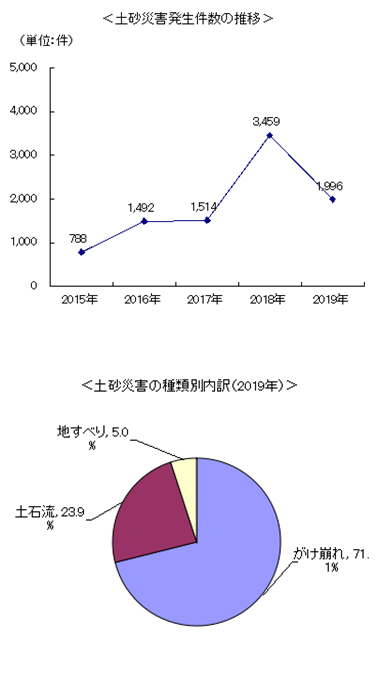 右図にみるように、国交省のデータから2015年~2019年における土砂災害(土石流、地すべり、がけ崩れ)の発生件数の推移をみてみますと、2015年では788件でしたが、2016年では1,492件とほぼ倍近く増えています。翌2017年は微増の1,514件にとどまりましたが、2018年は3,459件と大幅に増加しました。2019年は1,996件と減少しましたが、2018年は異常値とはいえ、ここ5年間でみても土砂災害が年々増加傾向にあることは明白です。