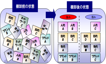 新事業開発、新商品開発を行う場合、外部からのニーズを把握する前に、自社で仮説を創っておかなければ、いくら市場調査を行っても何がニーズかどうか分からない。その仮説を創るための手法はいろいろあるが、弊社は『経営資源の棚卸調査』を行って、取り組むべき新事業開発、新商品開発のテーマを導き出し、そのテーマのニーズを確認している。『経営資源の棚卸調査』とは、「人」「物」「金」「情報」「ブランド」「ネットワーク」の経営資源を、棚から一度卸して再度見直してみようとすることであり、過去に開発中止になった事業や商品も同様である。「人」とは自社社員や協力会社社員のスキル、「物」とは既存商品、既存設備(工場)、「金」とは資金、「ブランド」は企業イメージや商品イメージ、「ネットワーク」は販売先や仕入れ先、などが経営資源となる。