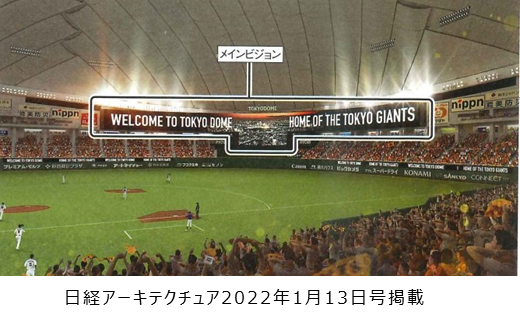 東京ドームのリニューアル工事は、①LEDビジョンの設置、②入場ゲートやコンコースのデザイン刷新、③観客席の新設、④キャッシュレス化などに向けたデジタル技術の導入を行う。目玉になるのが、国内スタジアムで最大規模となるメインビジョンの新設である。その大きさは、既存メインビジョン(面積約238㎡)の約4.4倍にあたる約1,050㎡。メインビジョンの新設に併せて最新の映像送出制御システムや照明制御システムを導入して、音楽や照明と連動した映像を映し出せるようにしてある。完成はオープン戦が始まる2022年3月としている。