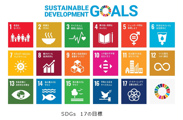 SDGsの17目標とは1.「貧困をなくそう」、2.「飢餓をゼロに」、3.「すべての人に健康と福祉を」、4.「質の高い教育をみんなに」、5.「ジェンダー平等を実現しよう」、6.「安全な水とトイレを世界中に」、7.「エネルギーをみんなにそしてクリーンに」、8.「働きがいも経済成長も」、9.「産業と技術革新の基盤をつくろう」、10.「人や国の不平等をなくそう」、11.「住み続けられるまちづくりを」、12.「つくる責任つかう責任」、13.「気候変動に具体的な対策を」、14.「海の豊かさを守ろう」、15.「陸の豊かさも守ろう」、16.「平和と公正をすべての人に」、17.「パートナーシップで目標を達成しよう」です。