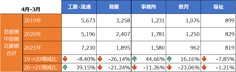 経済活動の再開に向けて試行した2021年度を、過去2年間の竣工状況とともに、KJ-NETの用途別で分析しました。
