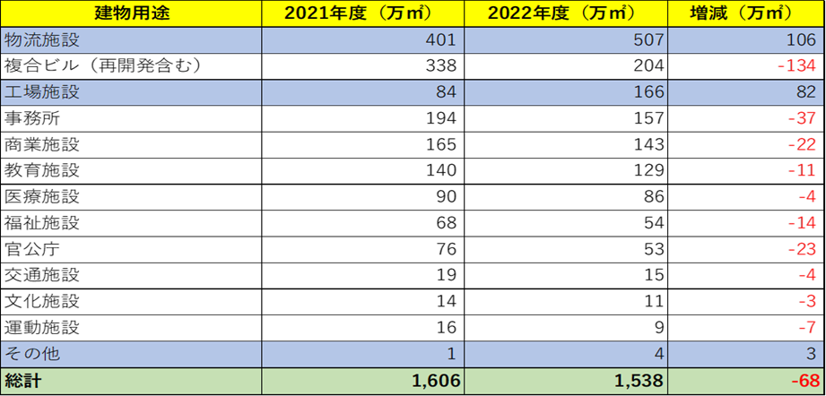 建物用途別傾向では、物流施設が507万㎡となり、前年度と比較して106万㎡増(対前年度比126.4%)、複合ビル(再開発含む)が204万㎡となり、前年度と比較して134万㎡減(対前年度比60.3%)、工場施設が166万㎡となり、前年度と比較して84万㎡減(対前年度比197.6%)、事務所が157万㎡となり、前年度と比較して37万㎡減(対前年度比80.9%)となり、物流施設と工場施設以外の建物用途は減少傾向にあります。