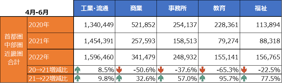資材高騰が懸念される2022年度第1四半期を、過去2年間の竣工状況とともに、KJ-NETの用途別で分析しました。