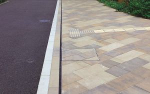 幅38mmの細いスリットが、タイルやインターロッキングの目地に馴染み、表層のパターン切替箇所においては境界を引き締め、引き立てる。
