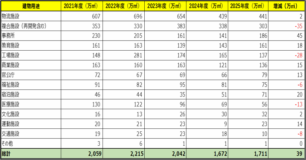 建物用途で多い順としては、「物流施設」が441万㎡、「複合施設(再開発含む)」が303万㎡、「事務所」が186万㎡、「教育施設」が161万㎡、「工場施設」が137万㎡、「商業施設」が136万㎡、となり、この6つの建物用途で非住宅全体の着工延床面積約80%を占めております。