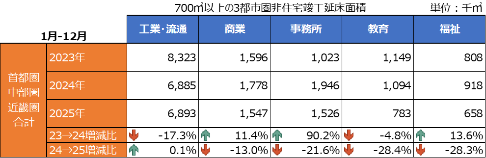 ①2025年12月10日配信時点のデータ ②竣工年:2023~2025年の1~12月 ③延床面積:空欄の物件は対象外 ④進捗:実施設計・設計完了・着工・竣工のみ ⑤工事分類:新築・改築・増築のみ ⑥各都市圏の分類:首都圏=東京・神奈川・埼玉・千葉、中部圏=愛知・静岡・岐阜・三重、近畿圏=大阪・京都・滋賀・兵庫・奈良・和歌山