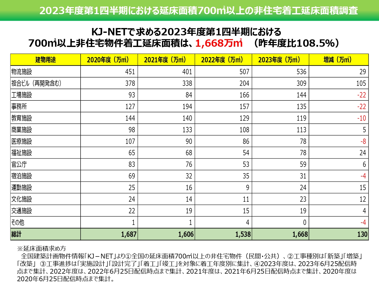 KJ-NET2023年6月配信時点での2023年度第1四半期の延床700㎡以上非住宅着工延床面積は、1,668万㎡となる。これは、前年度の同時期(2022年6月配信時点)と比較すると130万㎡増(対前年度比108 .5%)となる。